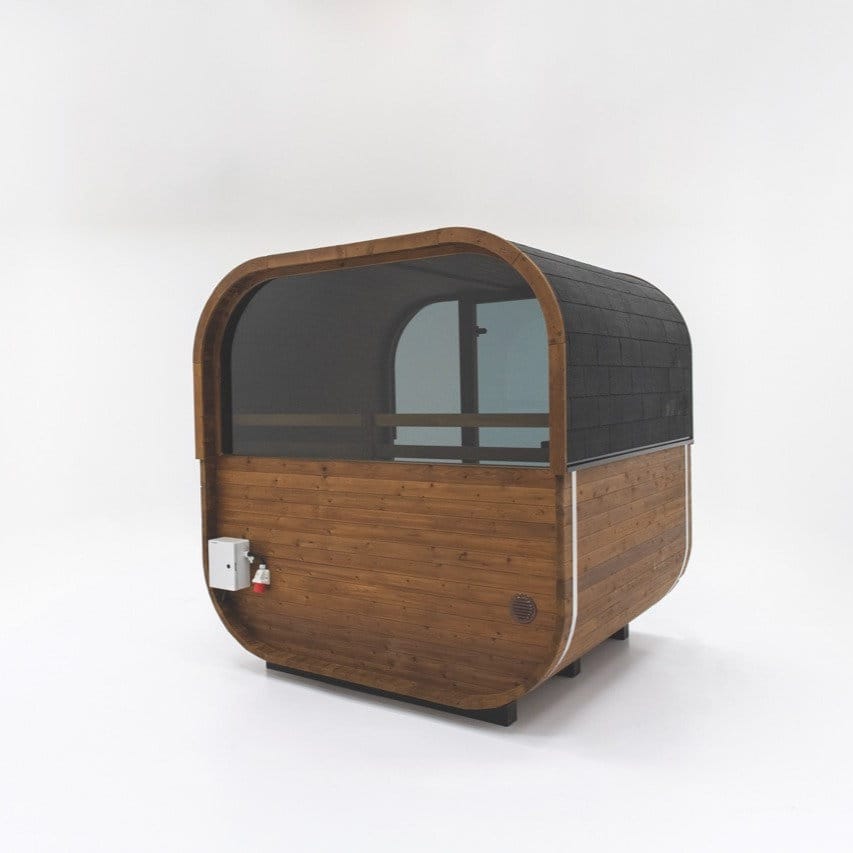 The cube is a sauna that combines style and functionality with its striking cube design and large glass panel.