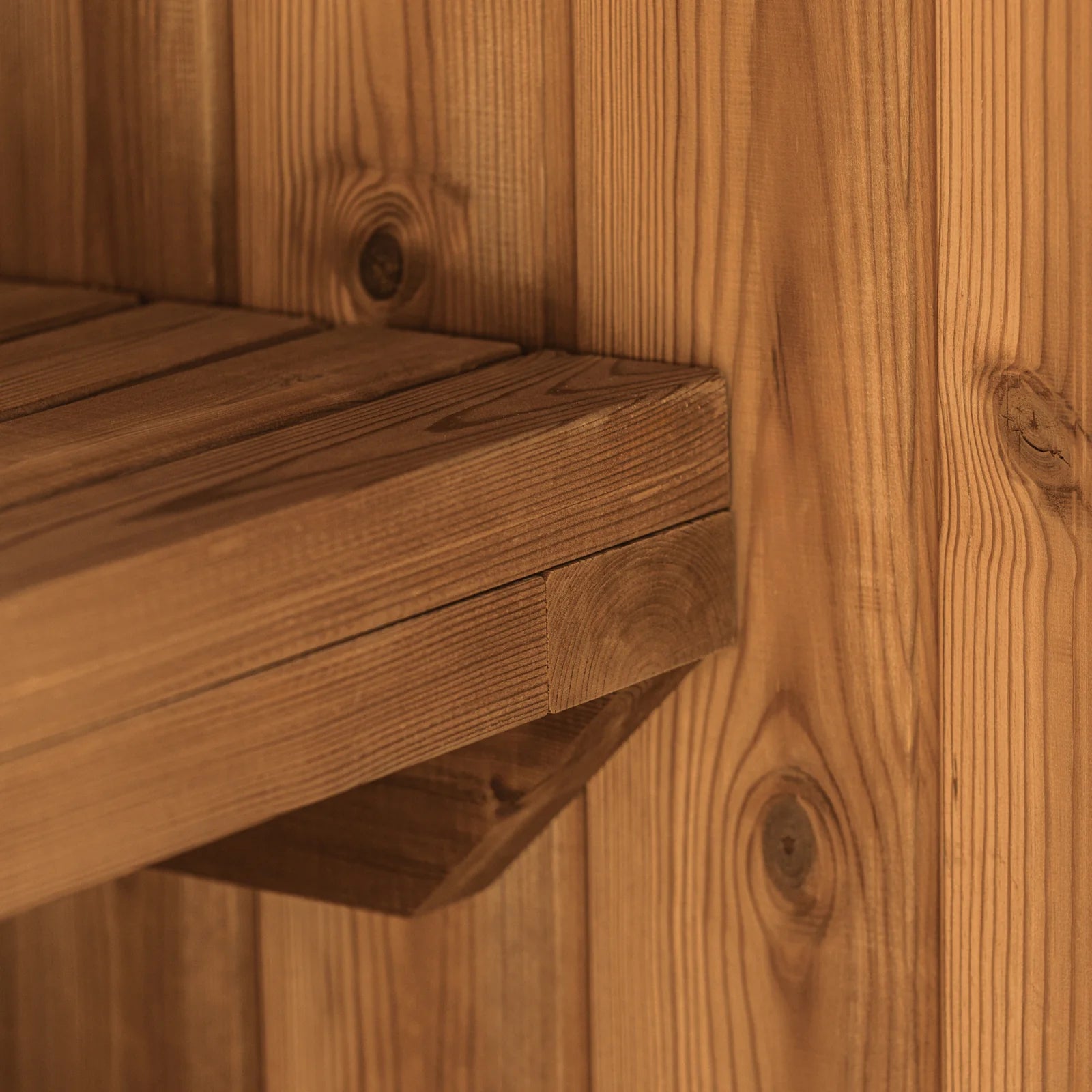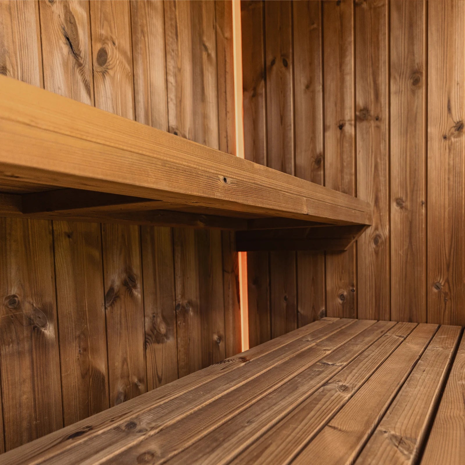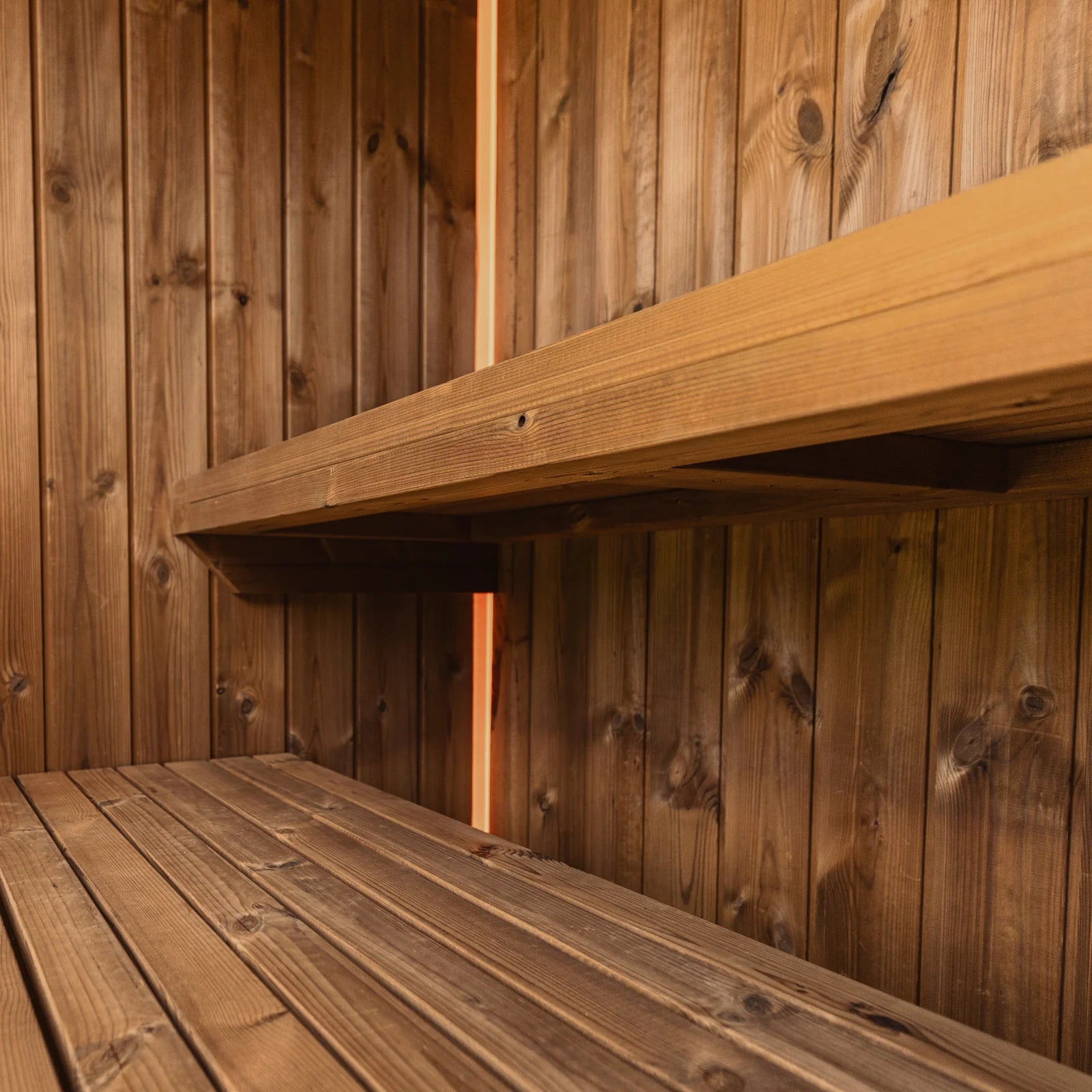 - Thermo wood: This wood has been specially heat-treated to enhance its weather resistance, making it perfect for outdoor use. Thermowood provides excellent insulation and resists heat and moisture, ensuring the electric sauna maintains its durability and efficiency for years to come.