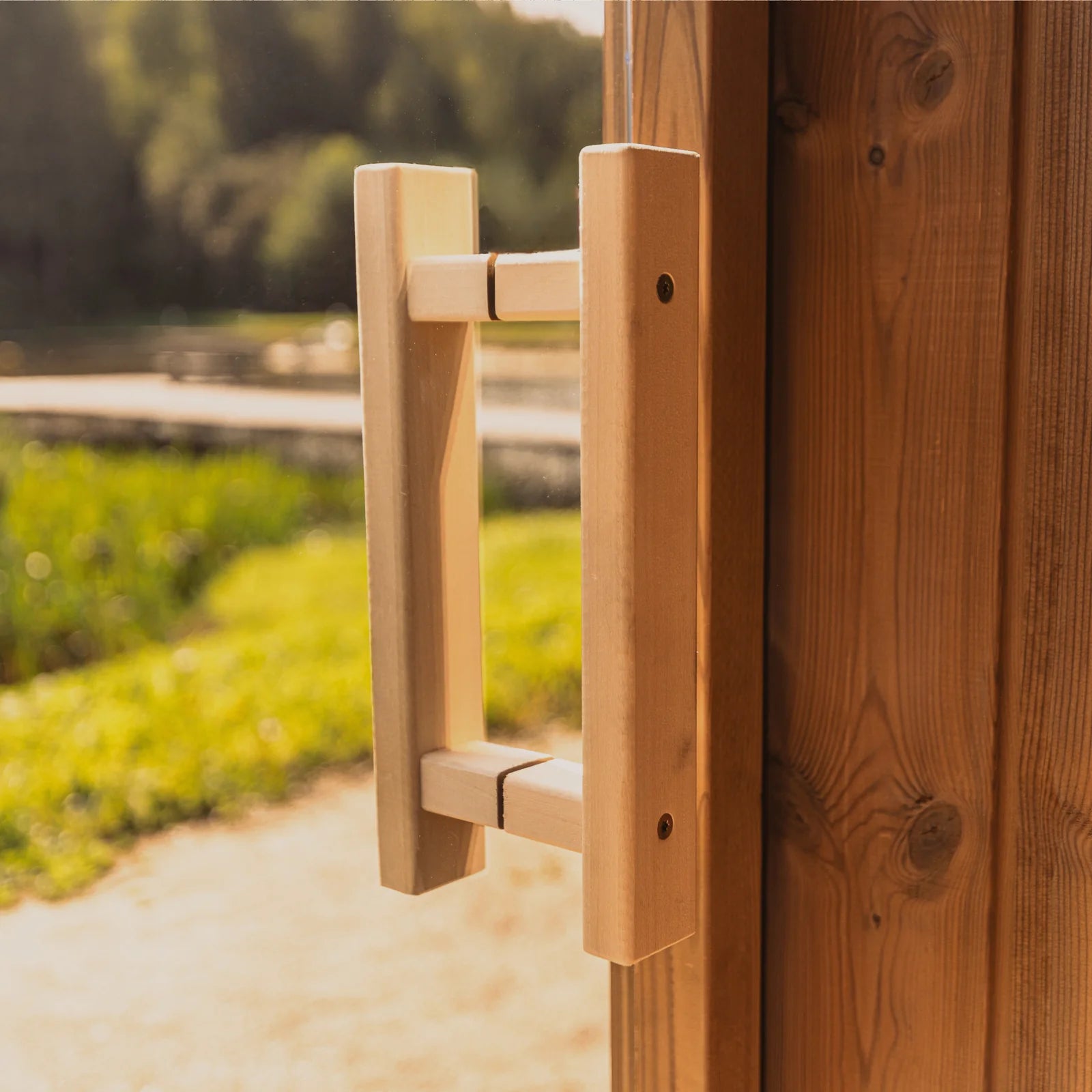 - Heat-retaining glass: The amber glass allows natural light in while minimizing heat loss. This ensures your sauna stays cozy and efficient without compromising its open, modern feel.